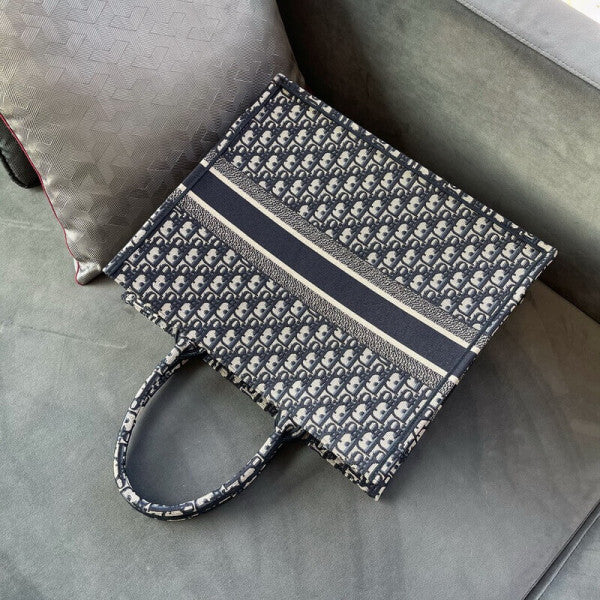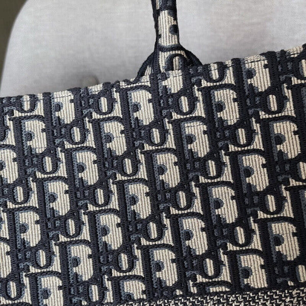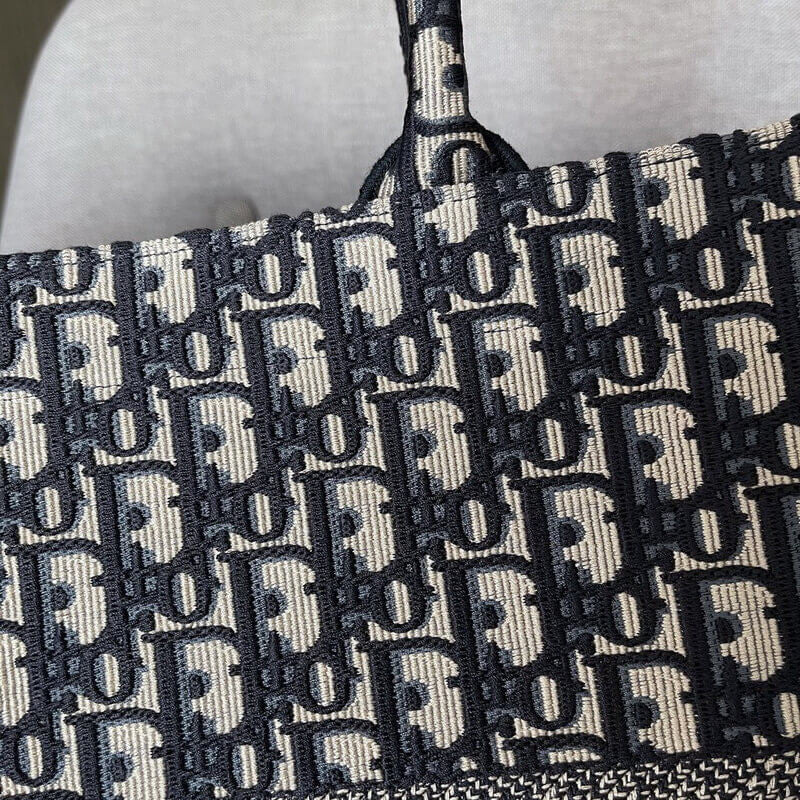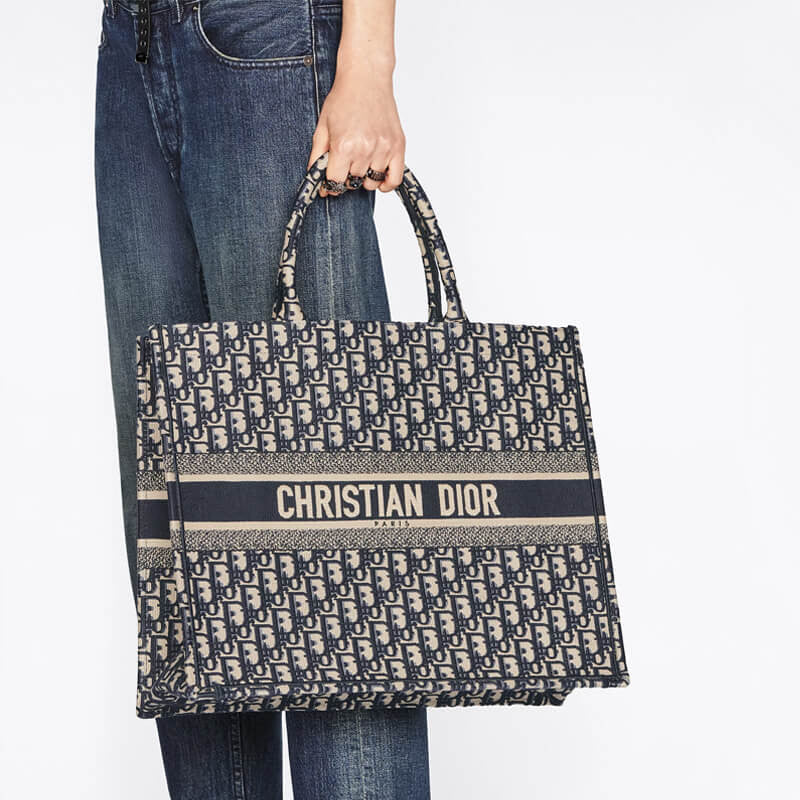 Introduced by Maria Grazia Chiuri, Creative Director of Christian Dior, the CD Book Tote has become a staple of the Dior aesthetic. Designed to hold all the daily essentials, the style is fully embroidered with the ecru and blue hallmark Dior Oblique motif. Adorned with the CD Paris signature on the front, the large tote exemplifies the House's signature savoir-faire and may be carried by hand or worn over the shoulder.