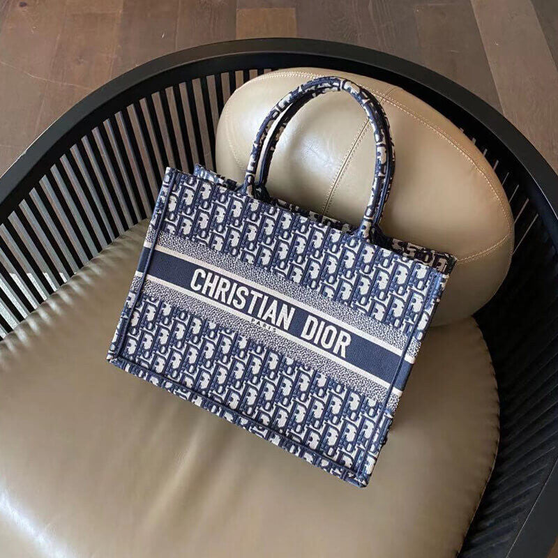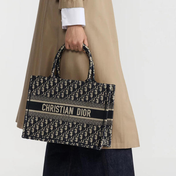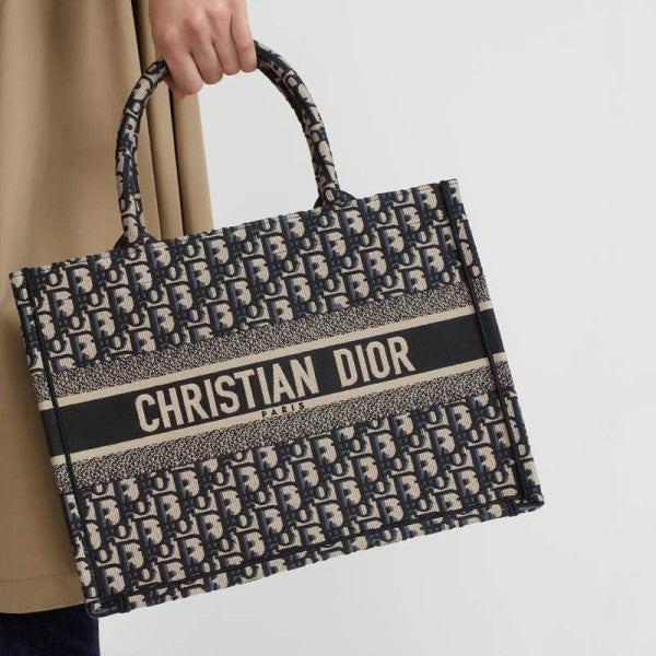 Introduced by Maria Grazia Chiuri, Creative Director of CDior, the Dior Book Tote has become a staple of the Dior aesthetic. Designed to hold all the daily essentials, the style is fully embroidered with the ecru and blue Dior Oblique motif. Adorned with the CD Paris signature on the front, the medium tote exemplifies the House's signature savoir-faire and may be carried by hand or worn over the shoulder.